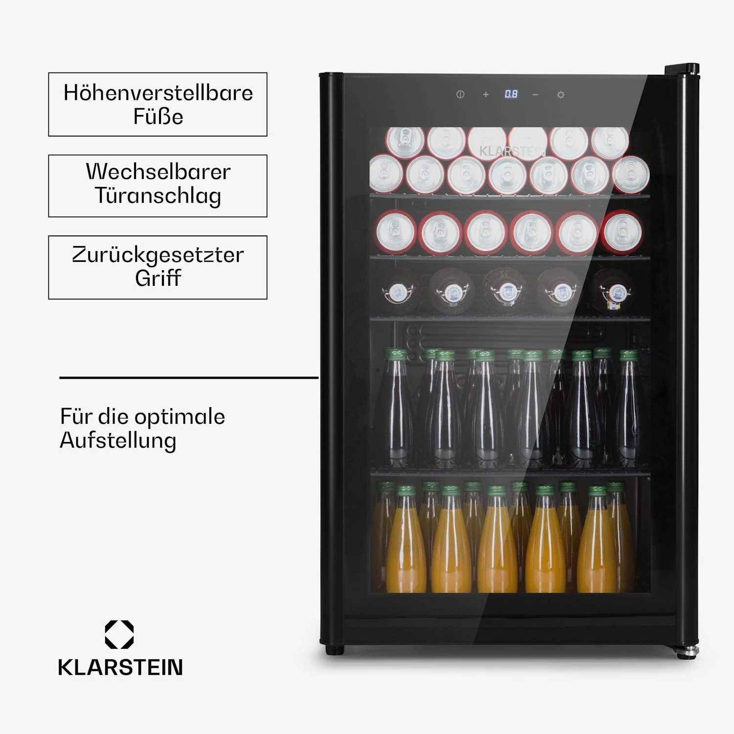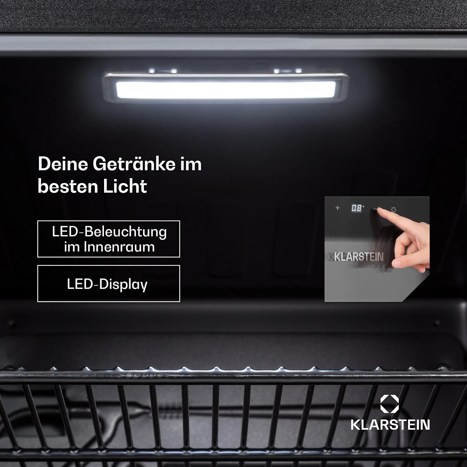 Vier Metall-Gitterböden bieten viel Platz für Speisen und Getränke. Die dreifach isolierte Panoramaglastür hält die Kälte drinnen und die Wärme draußen. Die gläserne Front mit schwarzem Rahmen ergänzt perfekt die ebenfalls schwarze Innenausstattung. Ein zusätzliches Highlight ist die LED-Innenbeleuchtung, die dem Beercave 115 den letzten Schliff verleiht. Die Kühltemperatur kann bequem per außenseitigem Touch-Bedienfeld auf 0 bis 10 °C eingestellt werden und sorgt für stets erfrischend kühle Getränke.
