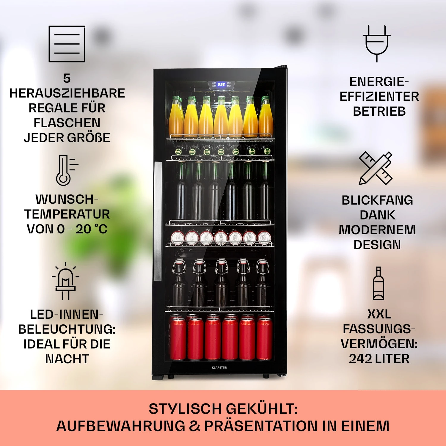 Gut gekühlt erfrischt besser: Der Klarstein Beersafe 7XL ist ein kompakter Getränkekühlschrank mit Glastür mit einem Fassungsvermögen von 242 Litern.