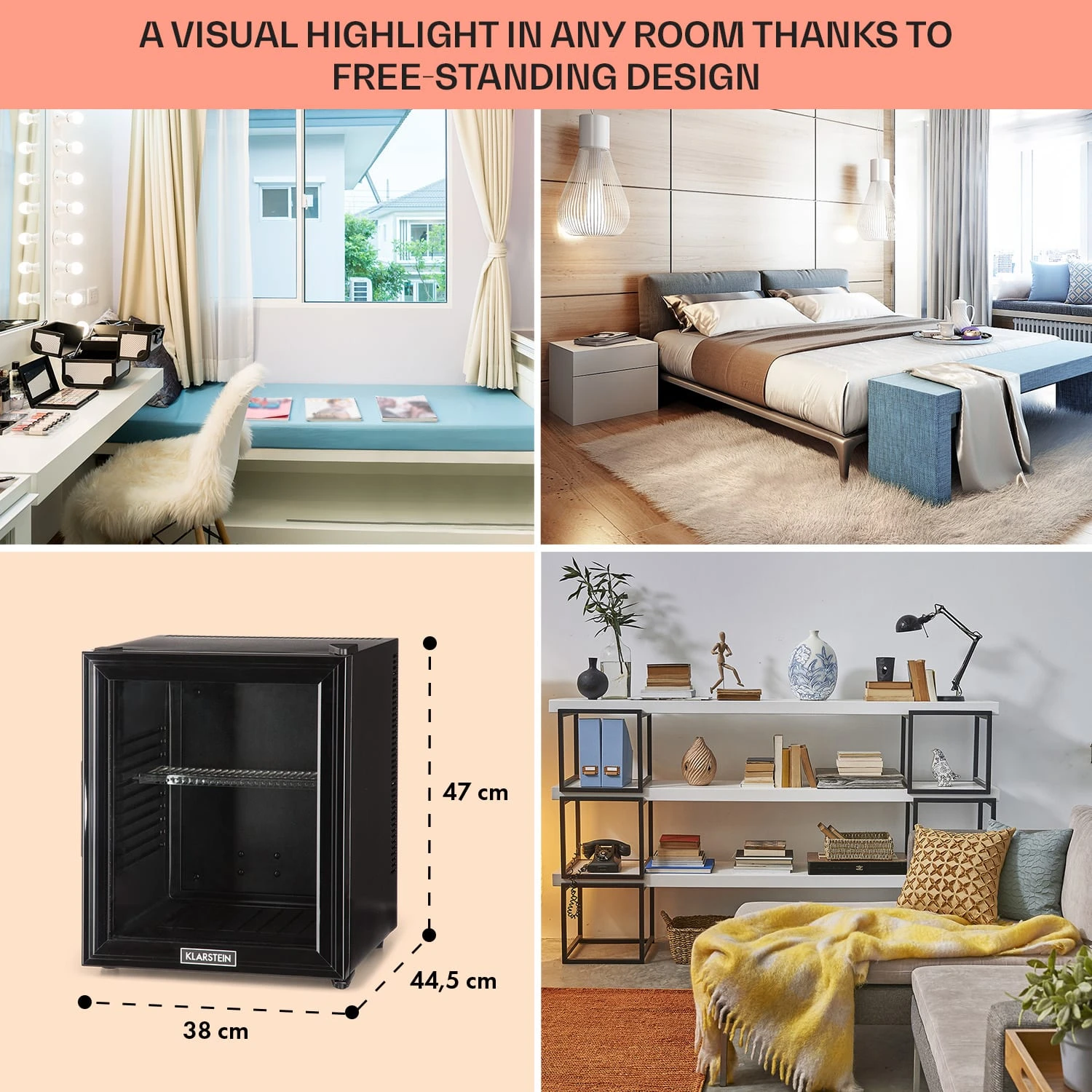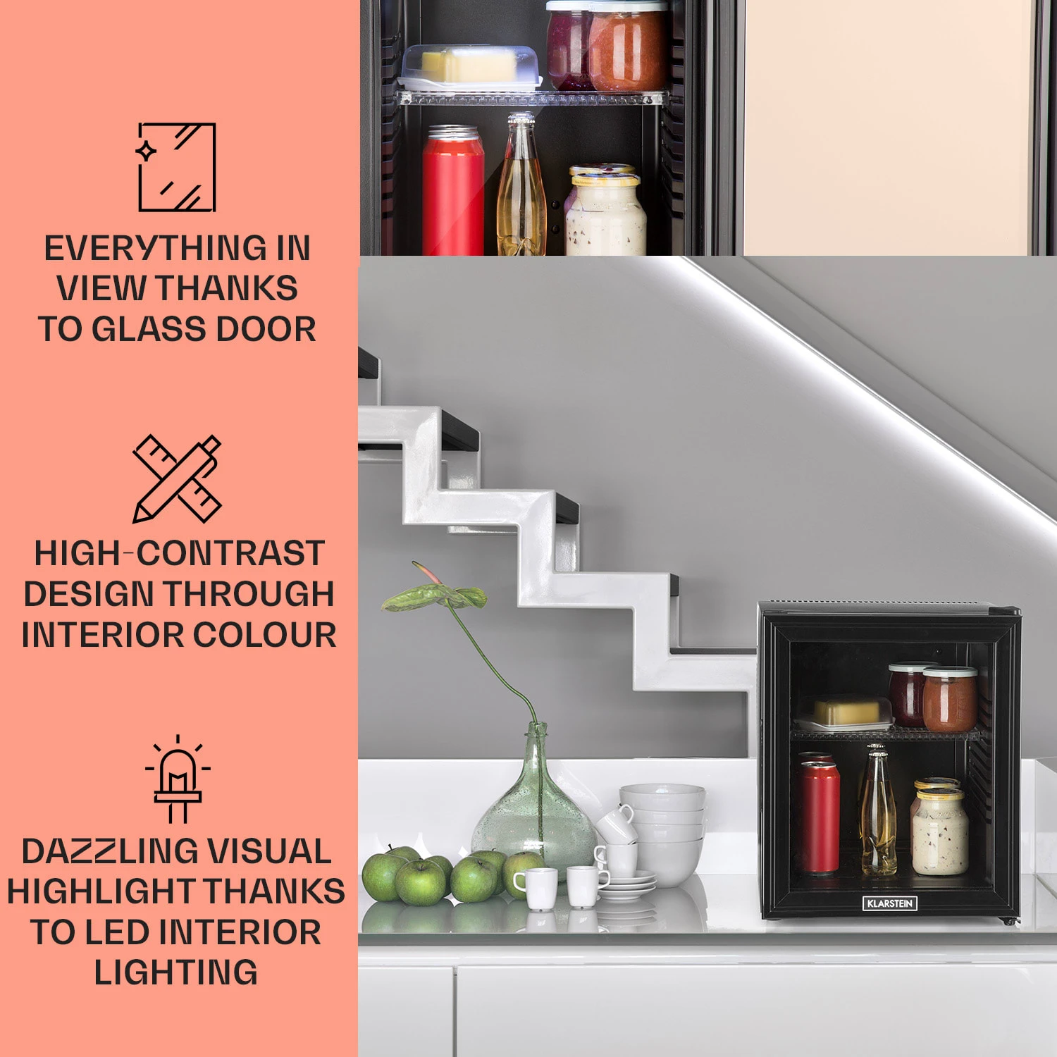 Kompakt und trotzdem ganz groß in Sachen Stauraum: Der Klarstein Brooklyn 32 Mini-Kühlschrank bietet mit 32 Litern Nutzinhalt viel Platz. Für die Kühlung nach Wunsch stehen 3 Stufen zur Regulierung der Kühlleistung von 12 bis 18 °C zur Verfügung. Besonderen Eindruck macht der Brooklyn 32 vor allem durch sein aufsehenerregendes Design: Eine Panorama-Glastür erlaubt ständigen Einblick in den Innenraum. Ein LED-Licht im Innern erhellt zudem die gelagerten Lebensmittel zuverlässig beim Öffnen der Tür.