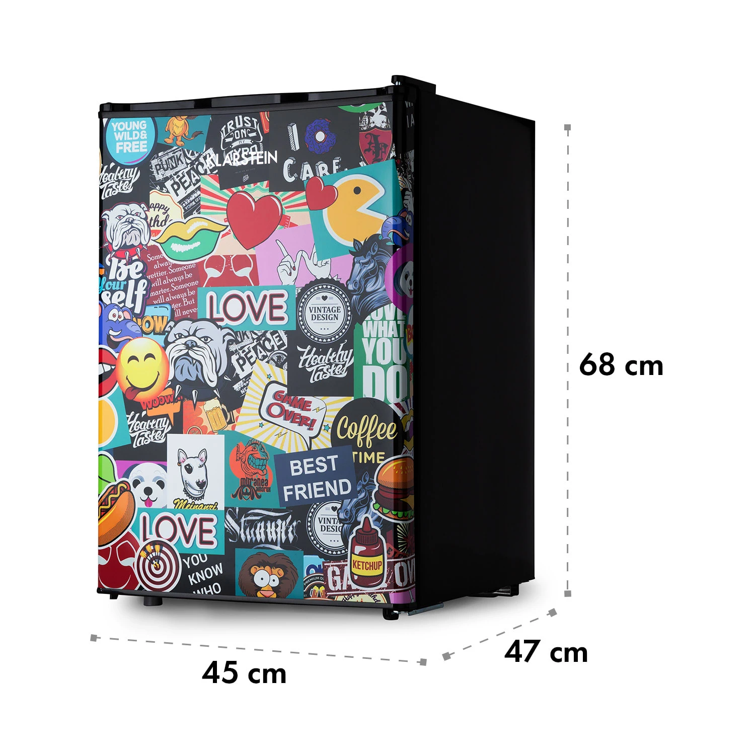 Der Comic-Superheld unter den Kompaktkühlschränken! Der Klarstein Cool Vibe 70+ Kühlschrank verfügt mit 72 Litern und 3 Ebenen über viel Platz für Lebensmittel aller Art. Zwei Türfächer bieten den nötigen Stauraum für Flaschen und Gläser. Zusätzlich hält das topseitige, separate Eisfach immer Eiswürfel, Tiefkühlkost oder Eiscreme bereit. Nicht nur mit seinem Innenleben macht der Cool Vibe 70+ seinem Namen alle Ehre: Seine Front ist mit einem erfrischenden Aufdruck im Stickerbomb-Stil gestaltet. Coole Sprüche, Emojis und freche Bilder – you name it, Cool Vibe 70+ has it!