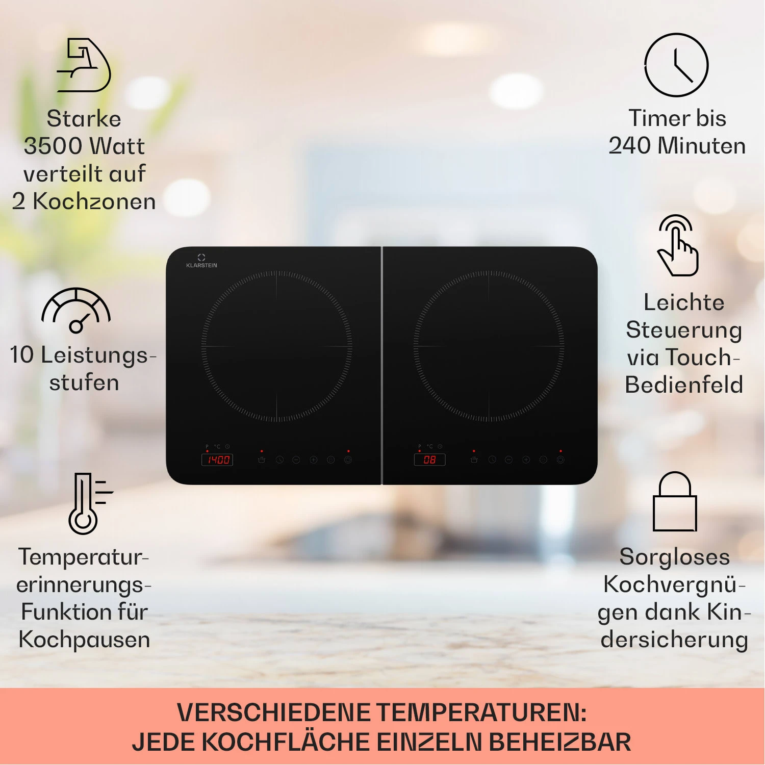- Leistung (linke & rechte Kochplatte): 2000 W + 1500 W