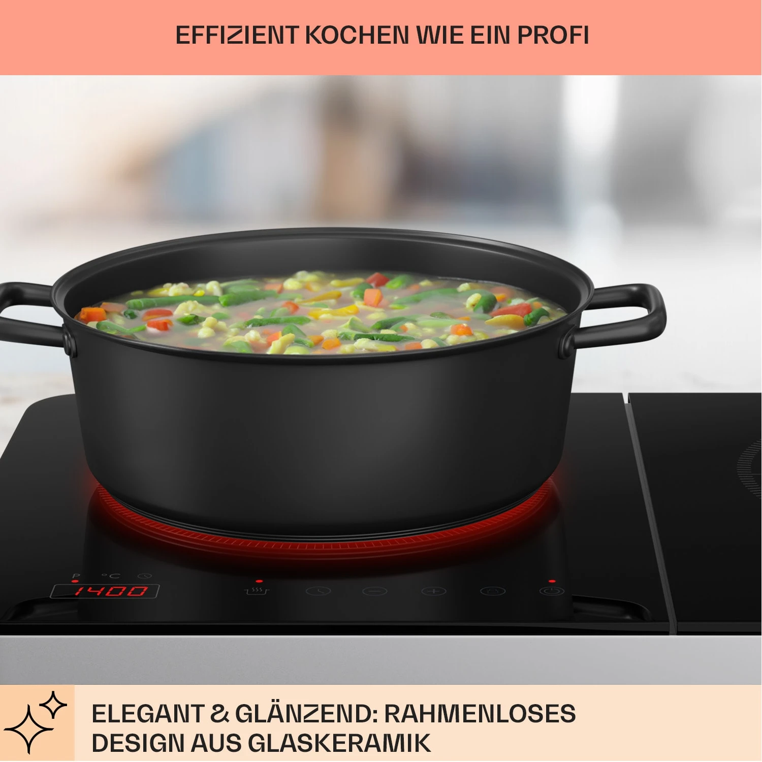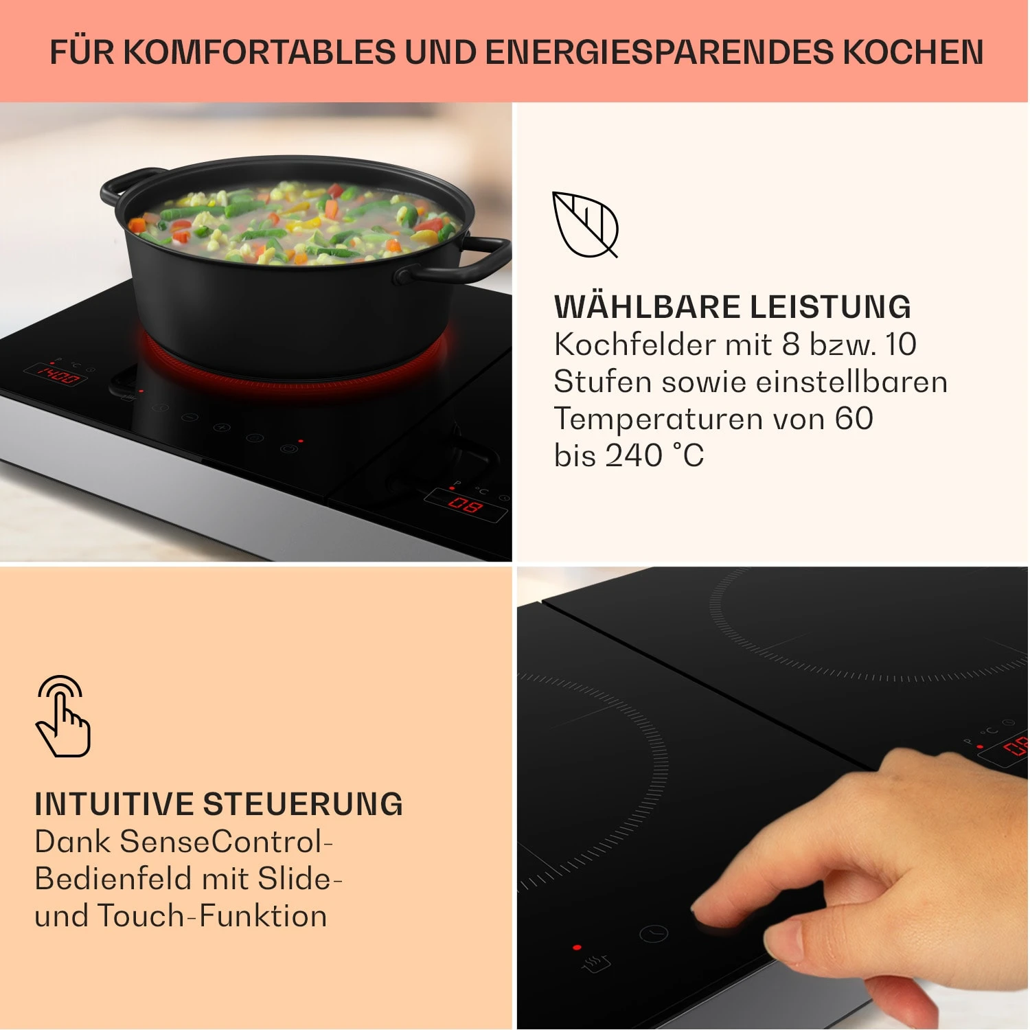 - Induktions-Kochfeld – geeignet für Kochgeschirr mit Stahl-/Eisenboden