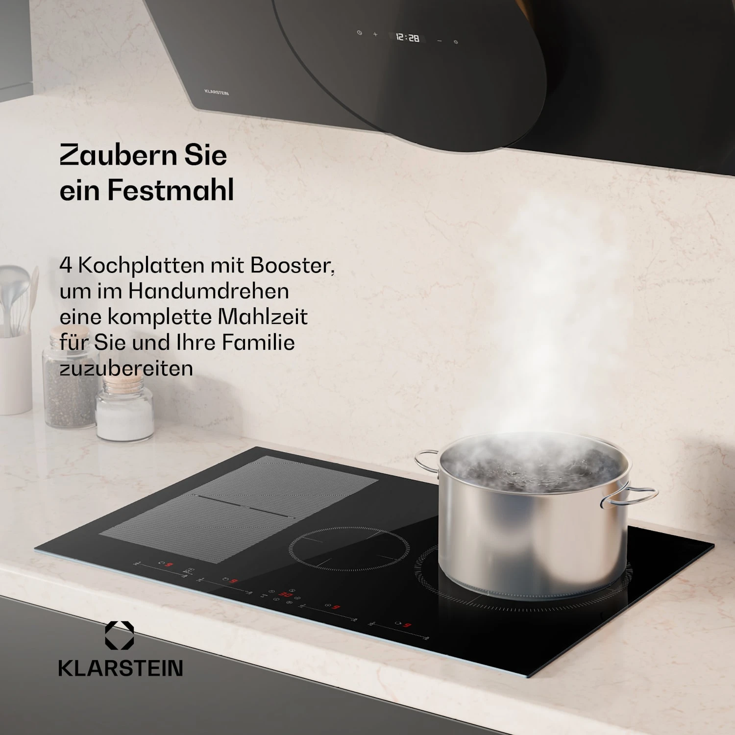 - Spar-Funktion: Kochzonen-Leistung wird automatisch reduziert, um Überlast zu vermeiden