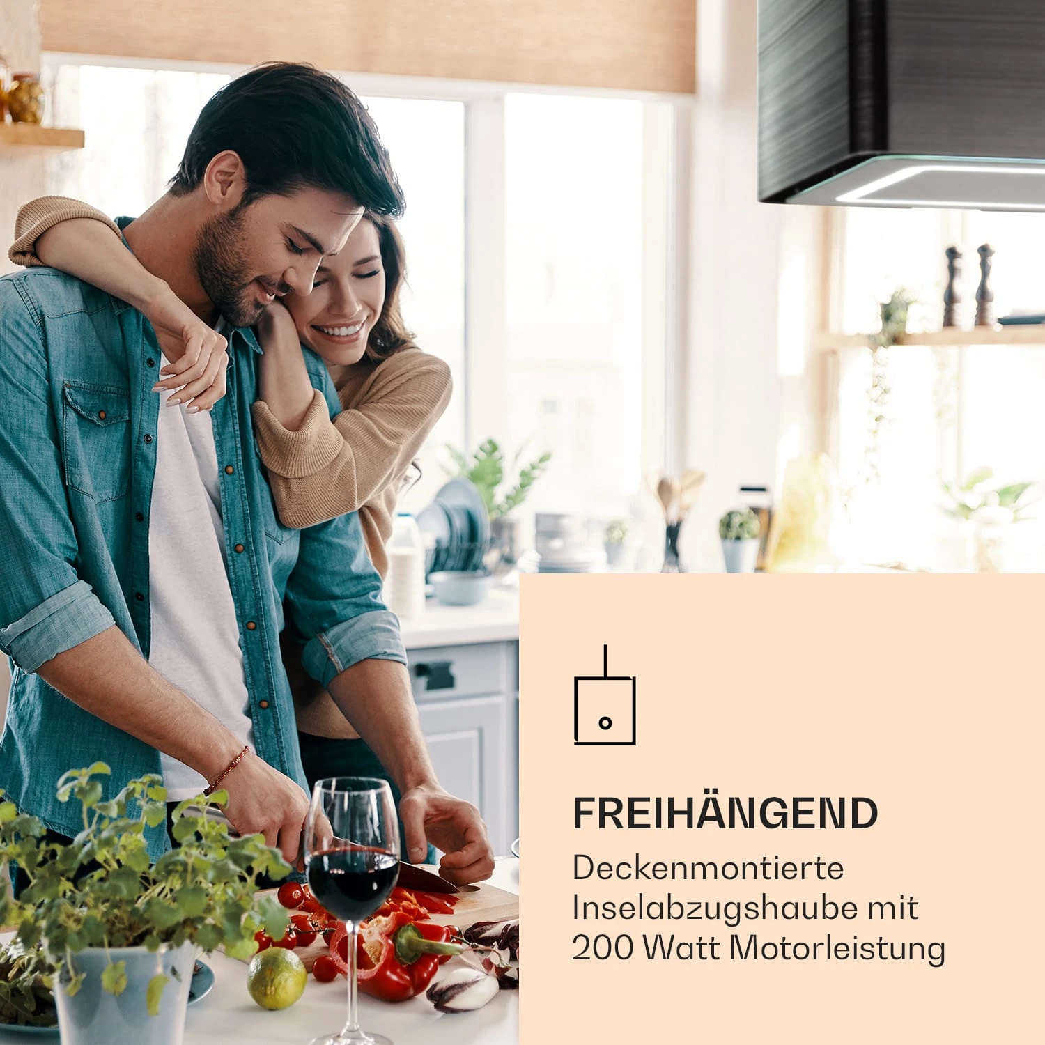 Freihängend: deckenmontierte Inselabzugshaube mit 200 Watt Motorleistung