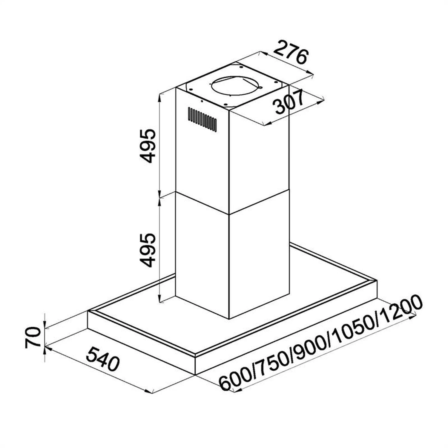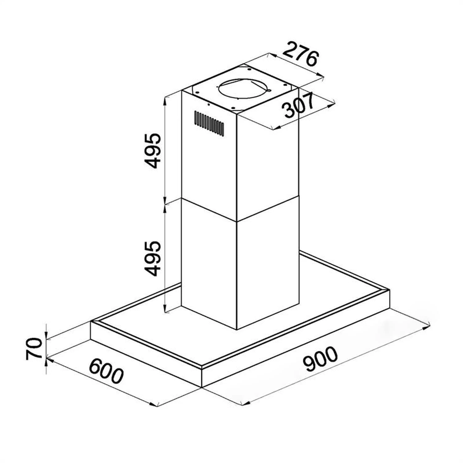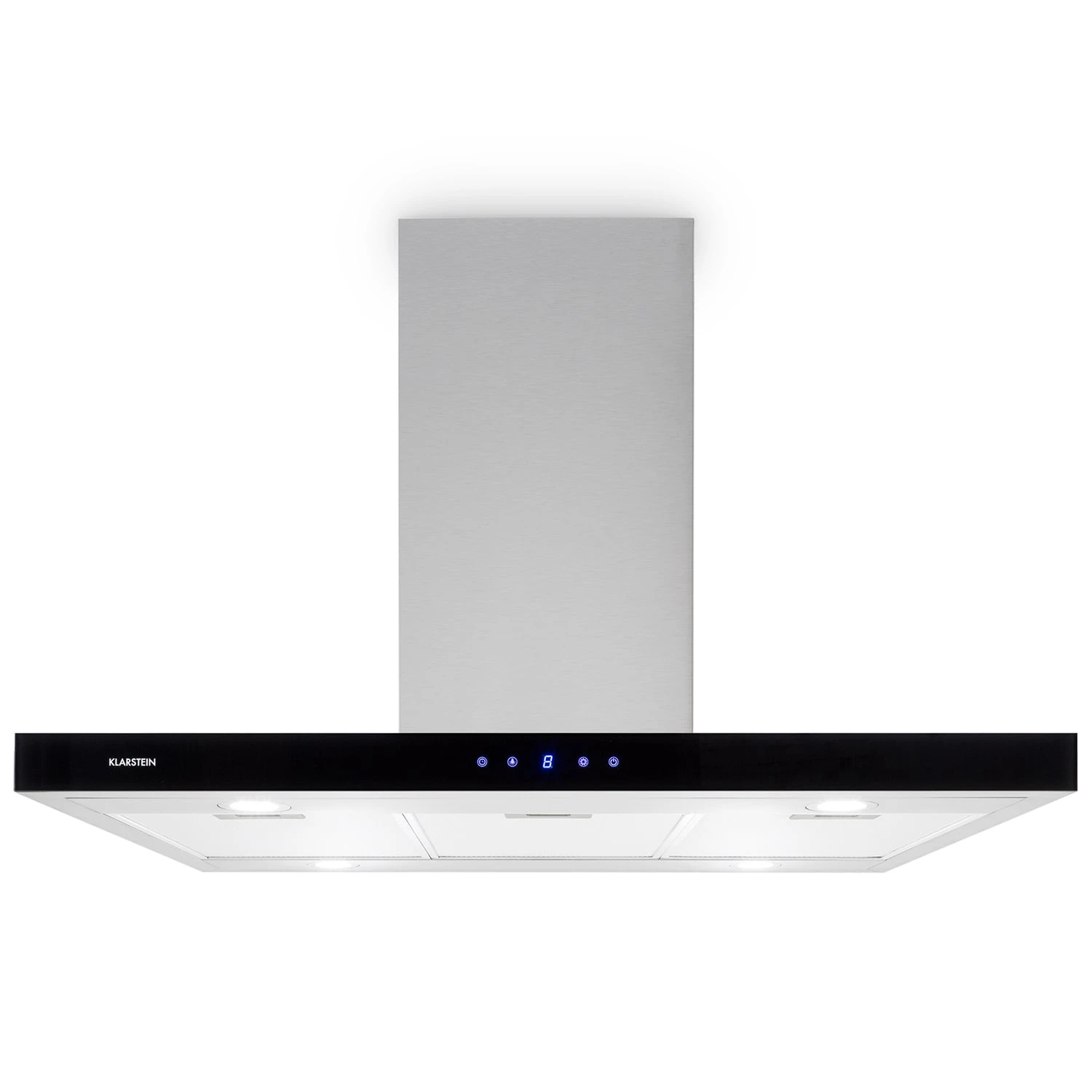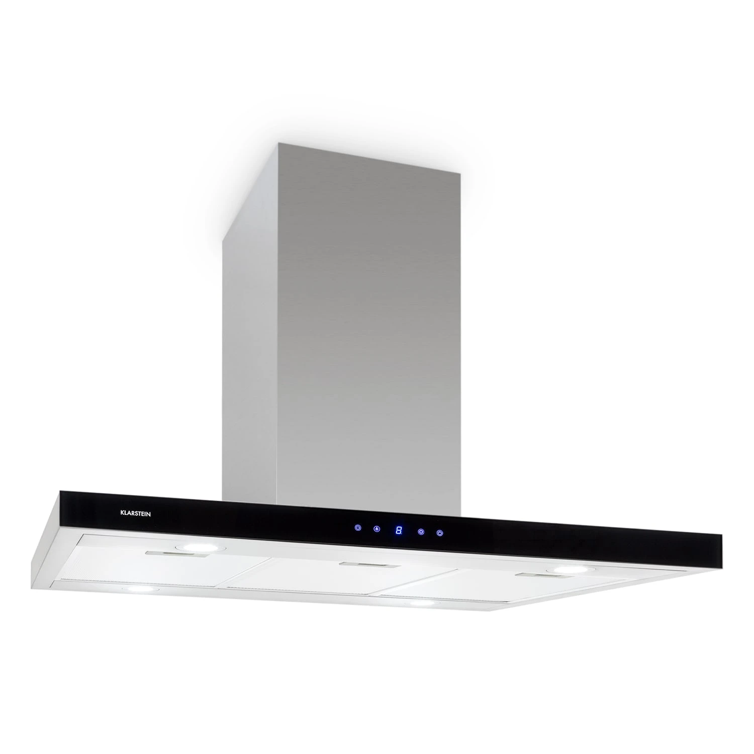 Dunstabzugshaube / Inselhaube mit Bedien-Front aus schwarzem Sicherheitsglas – Unterseite und Schacht aus gebürstetem Edelstahl