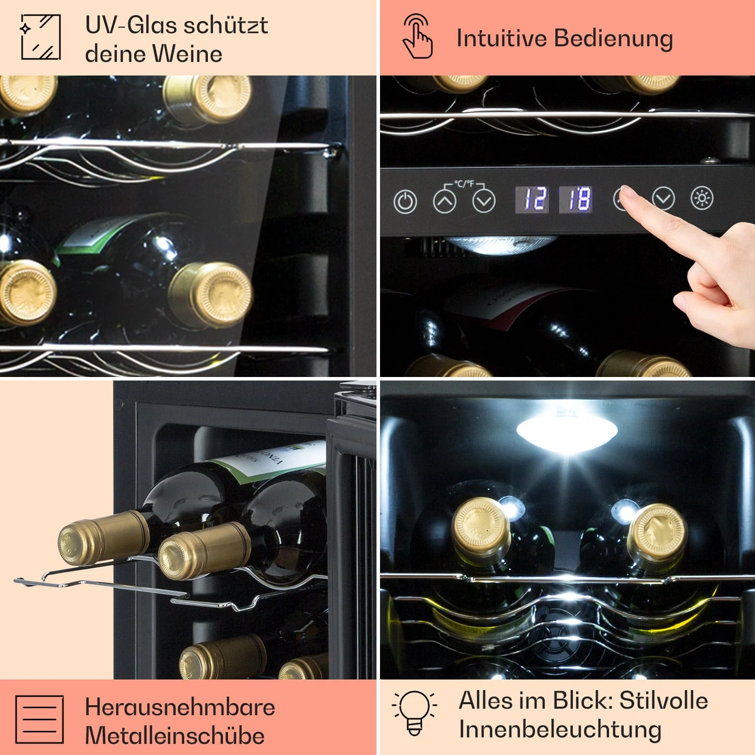 - Temperatur untere Kühlzone: 12 bis 18 °C (ideal für Rosé- und Rotweine und weniger stark gekühlte Erfrischungsgetränke)