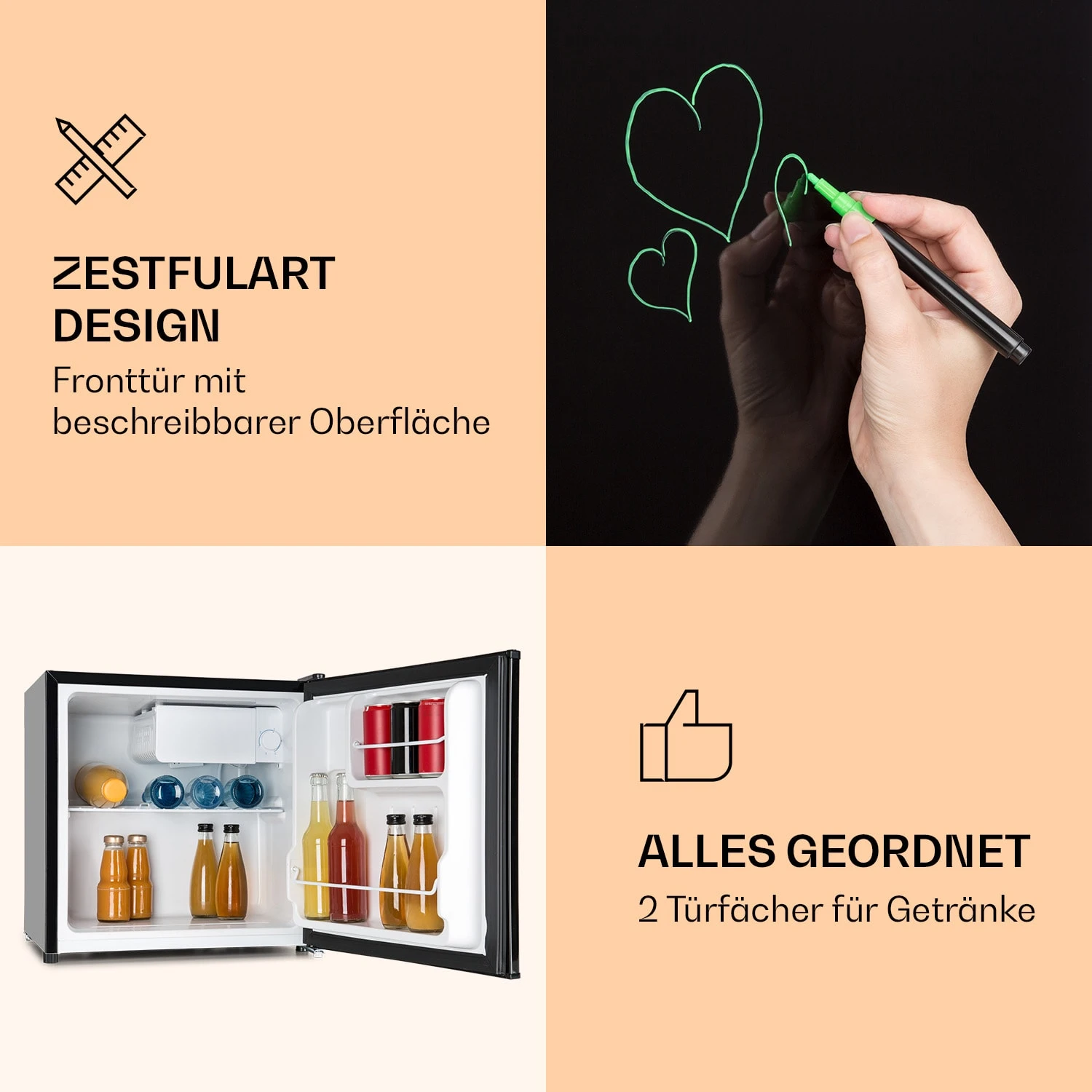 Der Klarstein Spitzbergen Aca ist nicht nur ein Kühlschrank, seine Front-Oberfläche ist wie ein White Board mit geeigneten Markern beschreib- und wieder abwischbar. Sie bietet viel Platz für Einkaufslisten, Notizen oder sogar Liebesbotschaften. Sein geräumiges Kühlfach mit 42 Litern Volumen und das topseitige Gefrierabteil mit 4 Litern bieten viel Platz für deine Lebensmittel. Für Ordnung sorgen 1 Gitterboden und 2 Türfächer. Über einen 5-stufigen Drehregler kannst du die Temperatur individuell einstellen.