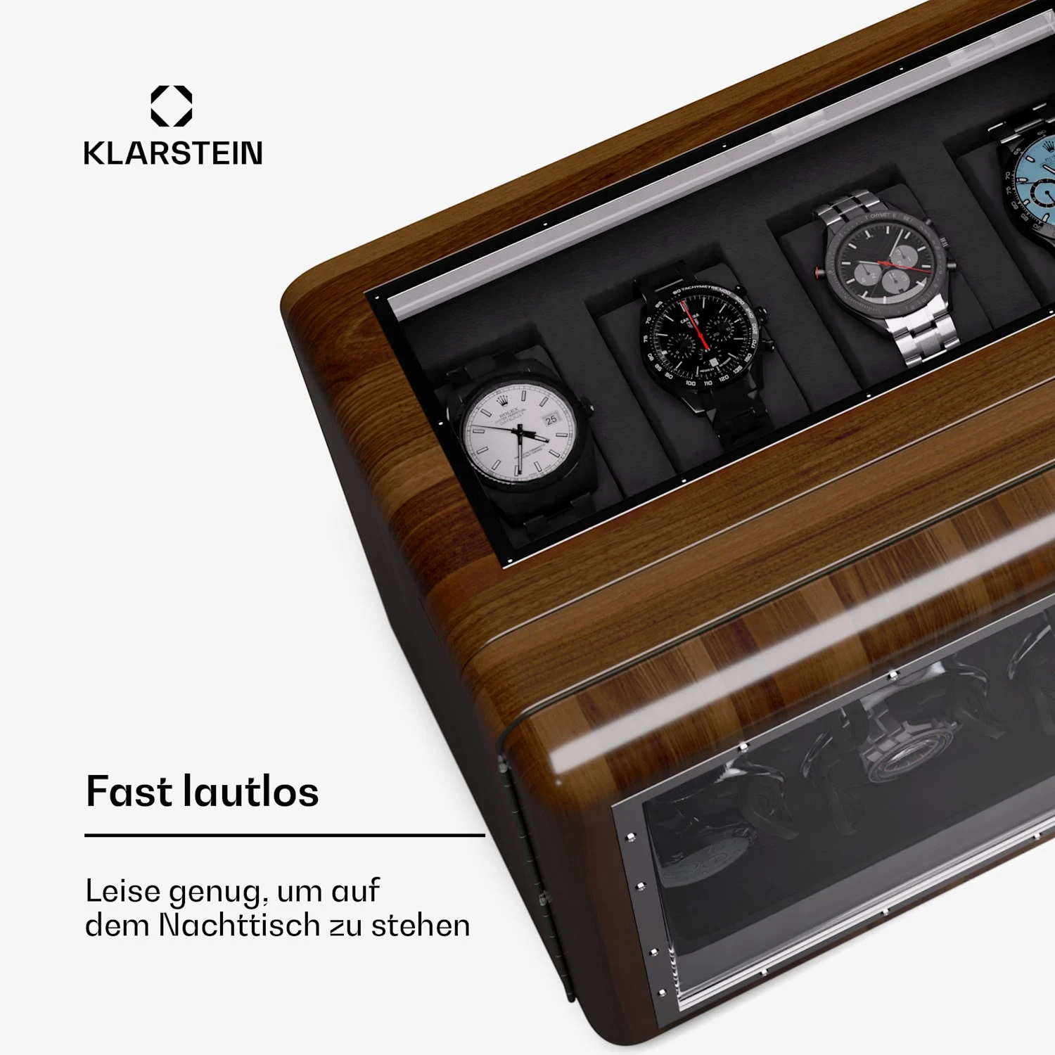 Der Klarstein Valmont 6+4 Uhrenbeweger kombiniert zeitlose Eleganz mit modernster Technologie, um deine Automatikuhren in Bestform zu halten. Mit seinem stilvollen Design fügt er sich nahtlos in jede Umgebung ein und wird zum Blickfang auf deinem Nachttisch oder in deiner Sammlung.