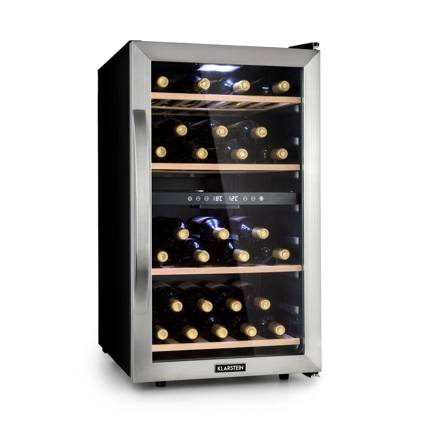 Aus Liebe zum Wein: Der Klarstein Vinamour 45 Duo Weinkühlschrank sorgt für besten Genuss, indem er auf zwei Kühlzonen roten und weißen Weinen gleichzeitig die richtige Trinktemperatur verschafft. Der Weinkühlschrank 2 Zonen bietet mit 118 Litern Volumen Platz für bis zu 45 Flaschen Wein und kühlt sie entweder auf 5 bis 12 °C in der oberen oder 12 bis 18 °C in der unteren Kühlzone. Dabei ist die Bedienung per Touch Control komfortabel und einfach. Dank dem beleuchteten Innenraum werden edle Flaschen gekonnt inszeniert und die Glastür bietet spannende Einblicke.