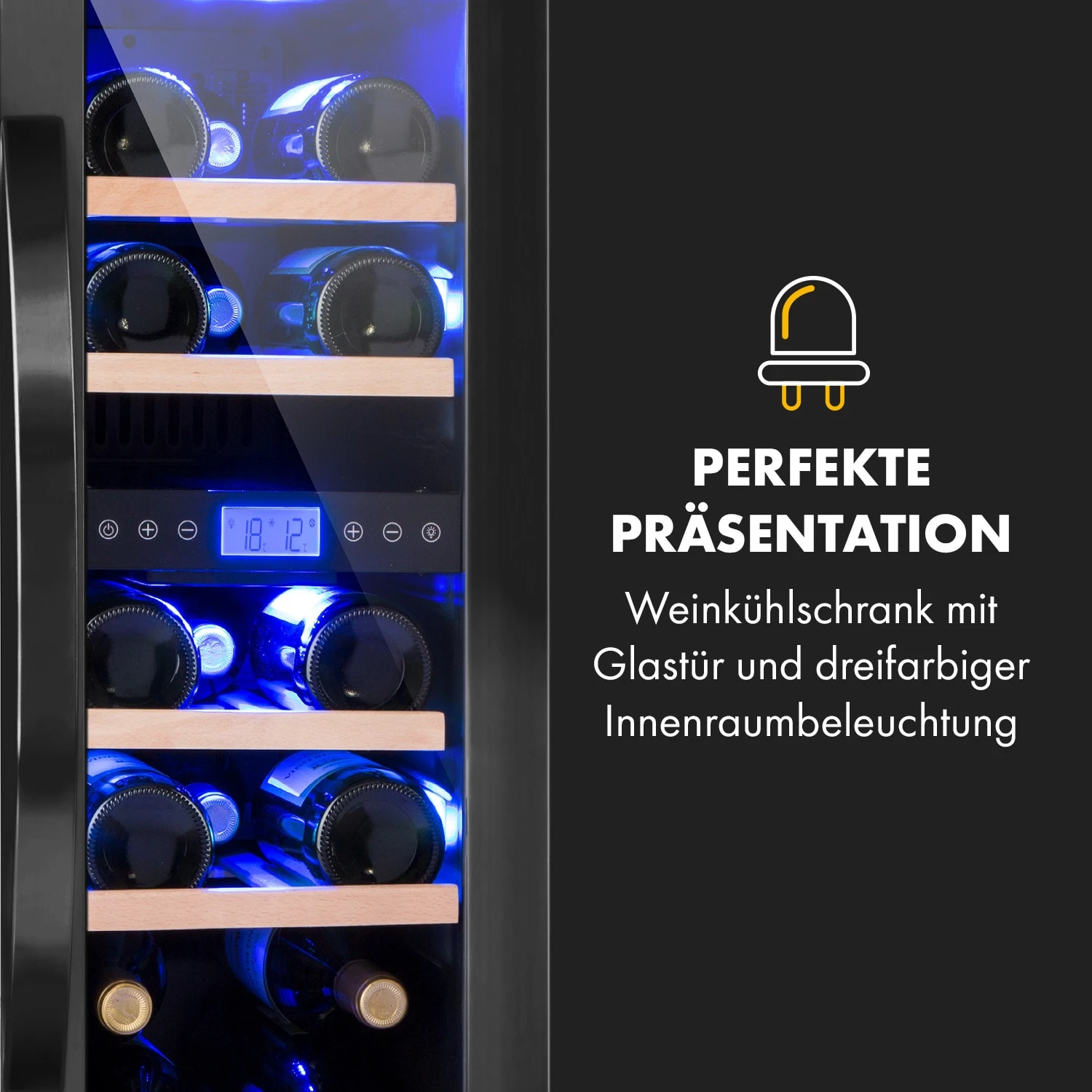 Edles Design und farbige Präsentation: Der Klarstein Vinovilla 17 Built-In Duo Doppelzonen-Weinkühlschrank passt dank Slim-Design in nahezu jede Lücke! Seine zwei Zonen kannst du separat temperieren, was dir eine zeitgleiche Kühlung und Lagerung von Rot- und Weißweinen ermöglicht. Der Weinkühlschrank 2 Zonen bietet aber auch Champagner, Schaumweine, Sekt oder andere delikate Tropfen lagern im Weintemperierer langfristig optimal. Neben besten Lager- und Kühlungsverhältnissen bietet er deiner Weinsammlung eine extravagante Bühne: Hinter Glas präsentieren sich die Flaschen wunderbar – rot, blau oder weiß beleuchtet.