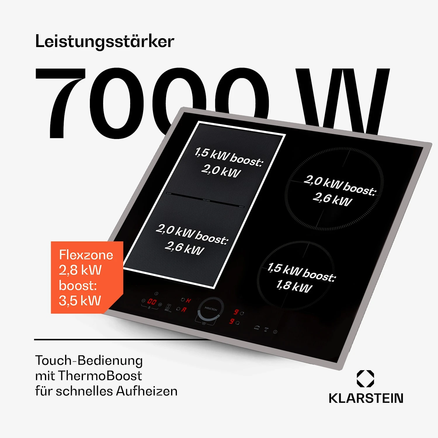 Kraftvolle Hitze: Gesamtleistung von 7000 Watt in vier Kochzonen mit je 2-mal 2000 und 1500 Watt Einzelleistung