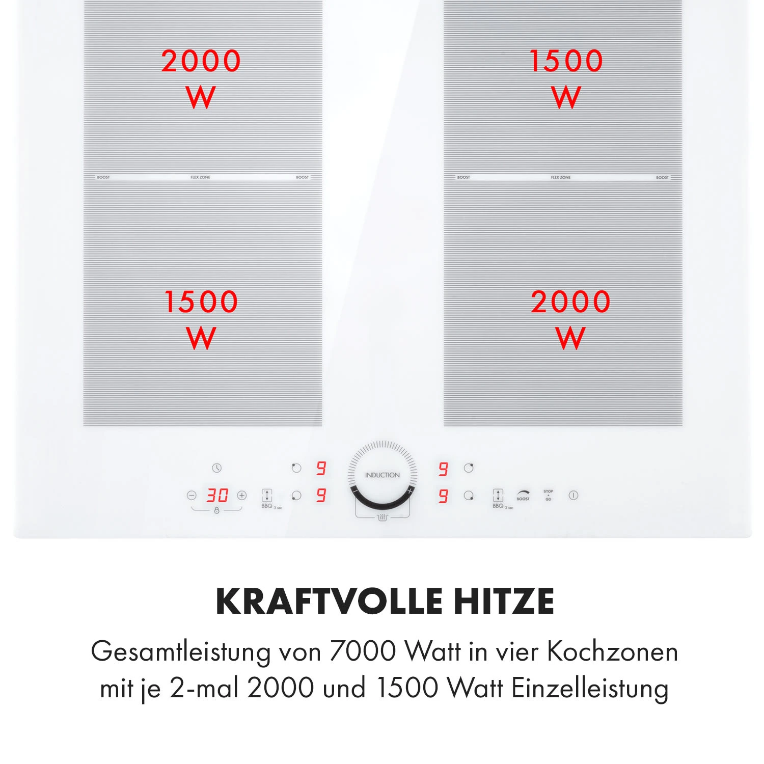 Kraftvolle Hitze: Gesamtleistung von 7000 Watt in vier Kochzonen mit Boost bis 2800 Watt