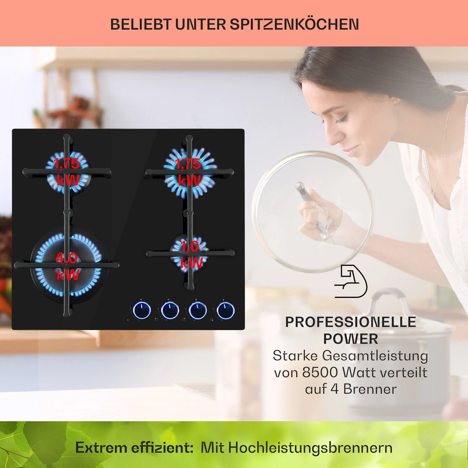 - Durchmesser Kochgeschirr Wokbrenner: ca. 24 – 26 cm (Ø)