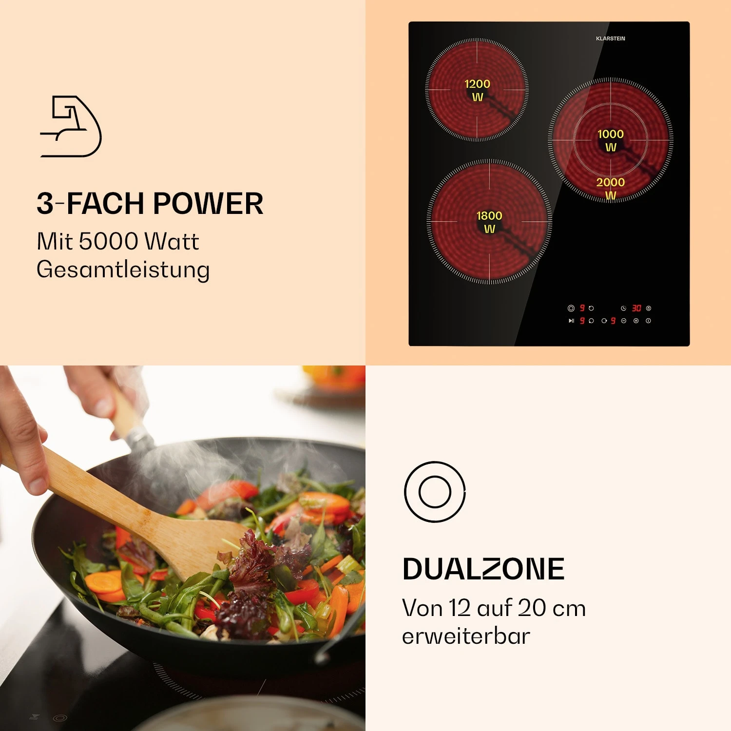 - Dualkochfeld (12 oder 20 cm Ø) mit 1000 oder 2000 Watt