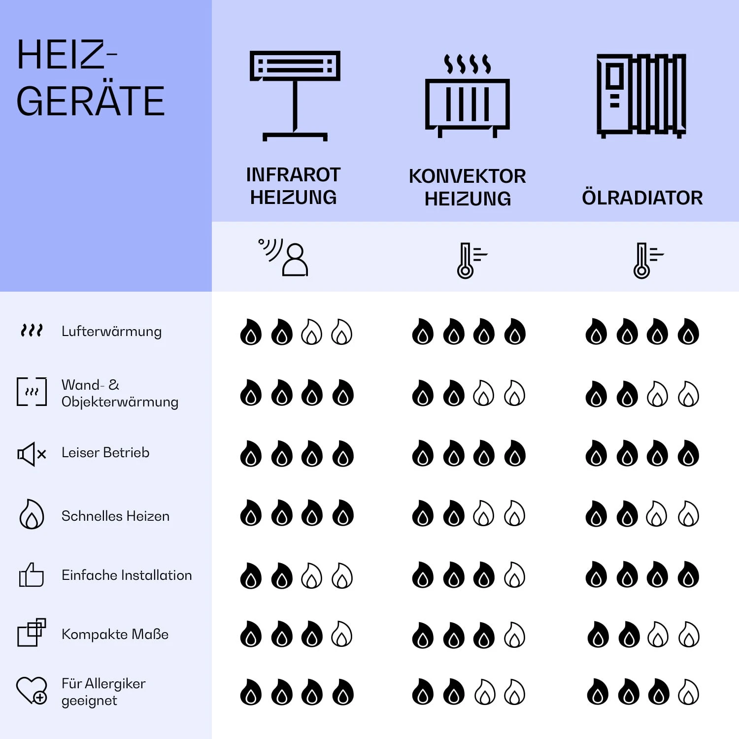 - IR ComfortHeat: erwärmt angestrahlte Personen und Gegenstände, keine direkte Luftaufheizung